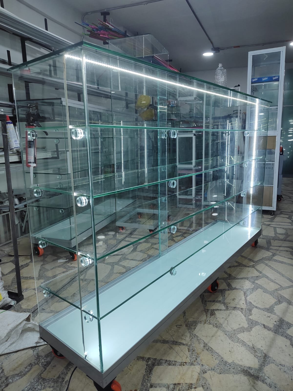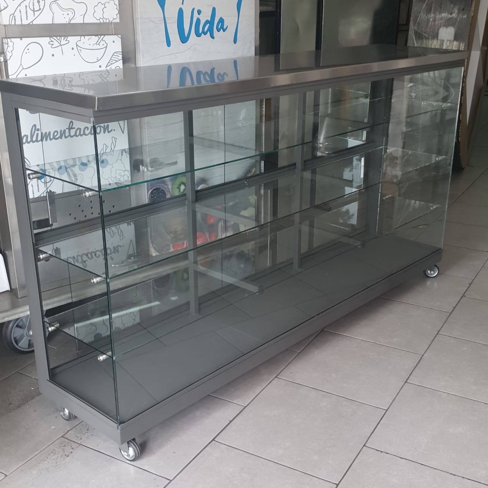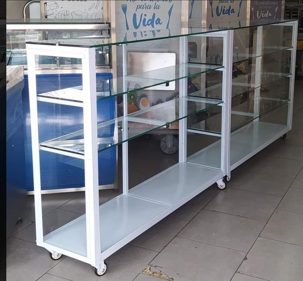 Fabricación en Vidrio Templado y Acero Inoxidable: Nuestras vitrinas están fabricadas con vidrio templado, lo que garantiza una alta resistencia a impactos y durabilidad. Además, utilizamos acero inoxidable y aluminio en la estructura, lo que asegura que la vitrina se mantenga en perfectas condiciones incluso en entornos de alto tráfico.